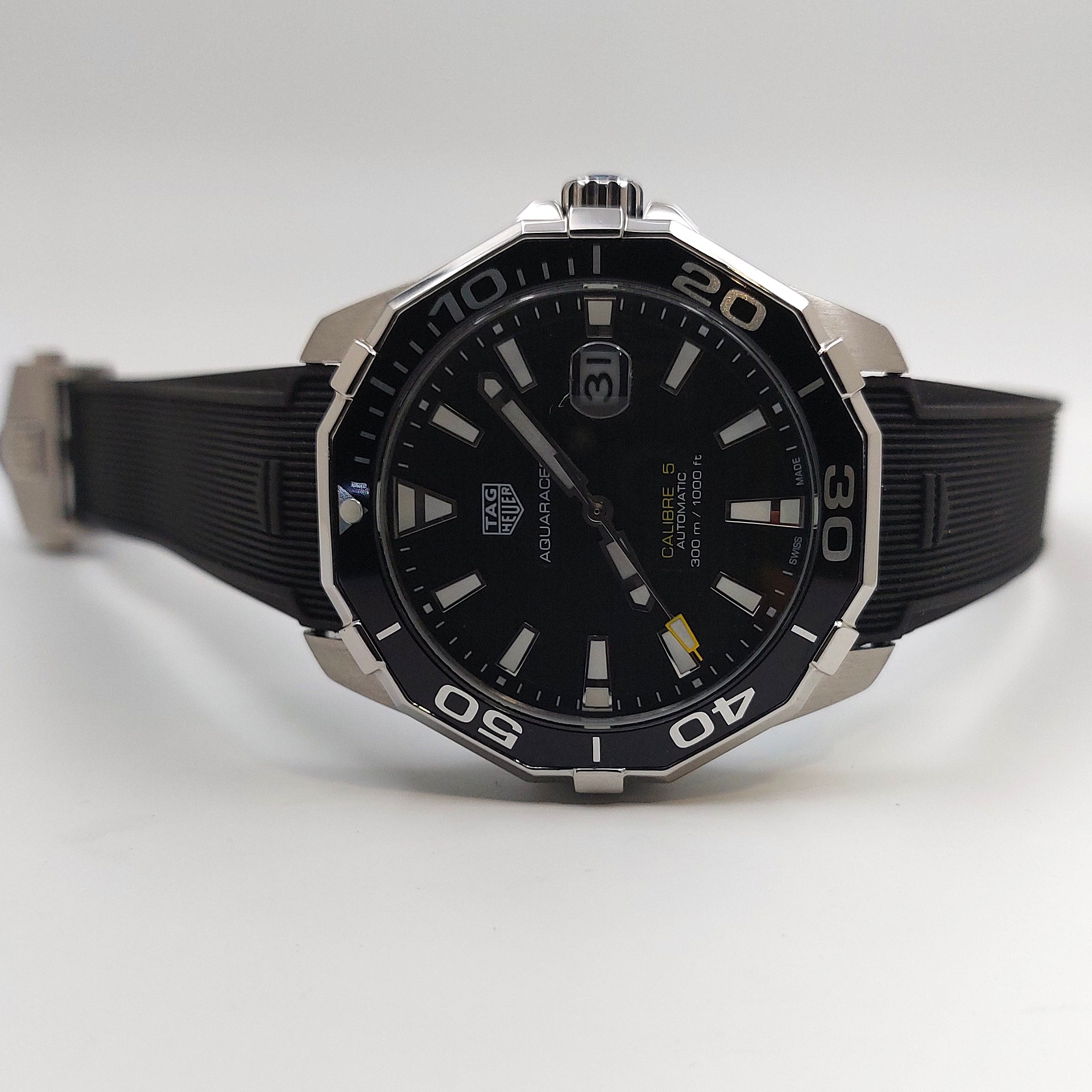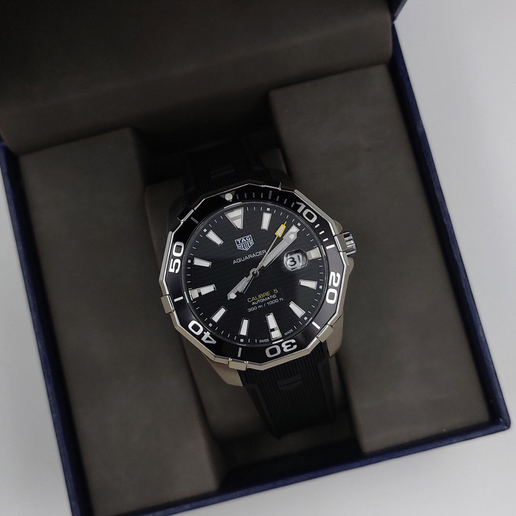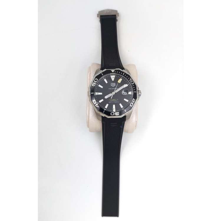 ساعت مچی مردانه Tag Heuer Aquaracer با طراحی حرفهای و الهامگرفته از ساعتهای غواصی، ظاهری قدرتمند و کاملاً اسپرت دارد. زِه قاب مشکیِ چرخان با درجهبندی ۰ تا ۶۰، در کنار قاب زاویهدار استیل، هویت ورزشی این مدل را بهخوبی نشان میدهد.